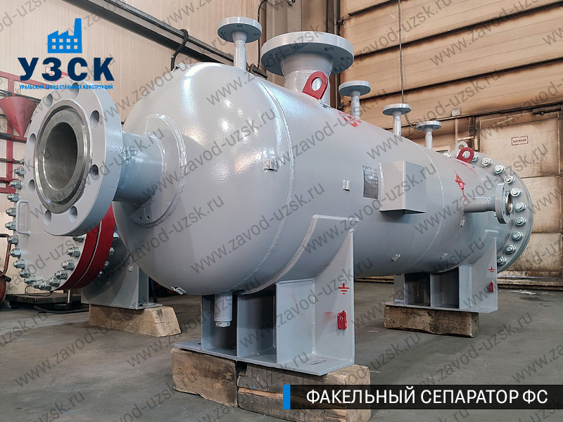 Факельные сепараторы ФС от ООО «УЗСК» спроектированы как горизонтальные цилиндрические аппараты, обеспечивающие максимальную эффективность разделения фаз. В основе конструкции лежат следующие элементы: