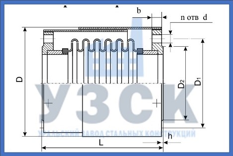 Простая и надежная конструкция компенсатора не требует обслуживания. Рабочая часть – сильфон выполнен, как многослойная гофротруба со стандартным количеством гофр – 6 штук. Сильфон выдерживает 1000 сжатий-растяжений при температуре 20 0 и сжимании на 20 % от первоначального размера. Фланцы в комплекте парные, один крепится на трубу, второй на патрубок компенсатора, изготовлены с фасками под прокладки. Снаружи имеется защитный кожух. Материал изготовления подбирается под рабочую среду. Защитный кожух входит в комплектацию, гильза устанавливается, как дополнительный компонент, по заказу.