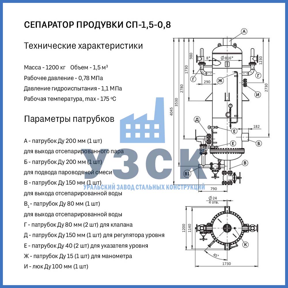 Компания «УЗСК» производит надежные сепараторы продувки типов СП и СНП, соответствующие требованиям ТР ТС 032/2013, для работы в составе систем теплоснабжения и технологических линий.