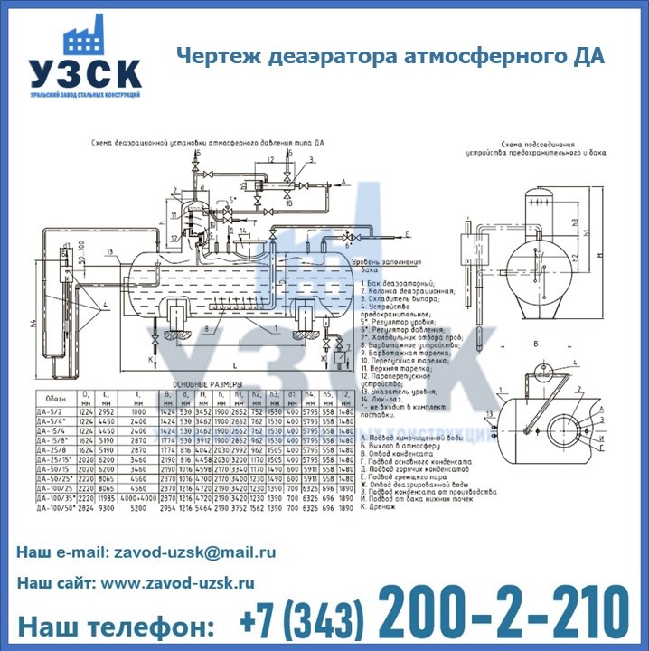 Приобрести качественное оборудование, в том числе, деаэраторы ДА, можно в компании УЗСК в Ульяновске. Мы предлагаем долговечную и надежную продукцию по приемлемой цене. Заказать и купить деаэраторы или другие изделия высокого качества можно через сайт Уральского Завода Стальных Конструкций, или позвонив по указанному в разделе «Контакты» телефону.